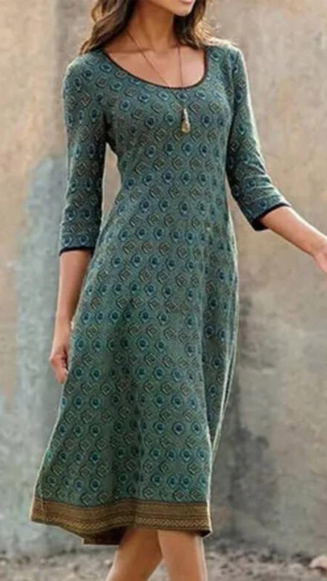 Bohemian Style 3/4 Sleeve Round Neck Printed Dress