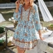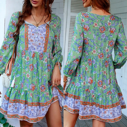 Bohemian Style 3/4 Trumpet Sleeve Square Collar Printed Dress