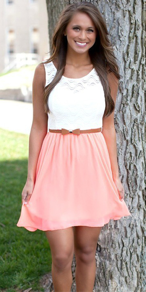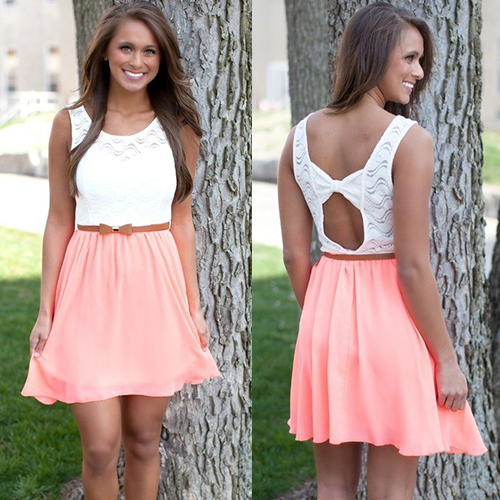 Lace spliced design,making it so feminine. backless design,with a sweet bowknot for decoration. Sleeveless,round neck