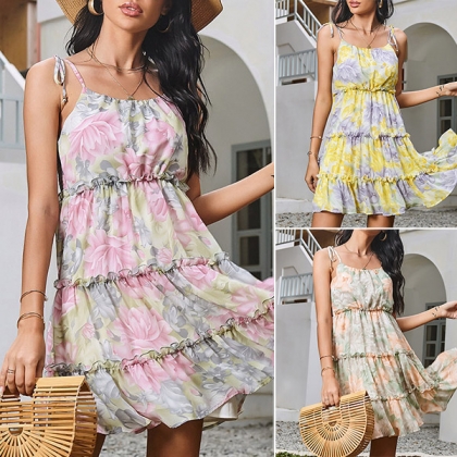 As for your beach days and weekend trips,this beautiful printed dress is worth to be your perfect partner. Sling style,with backless and ruffle hem design,this dress can exude your sweet yet feminine side. On these sunny days,addig a sweet straw hat would be more perfect!