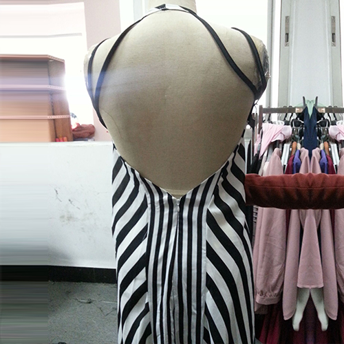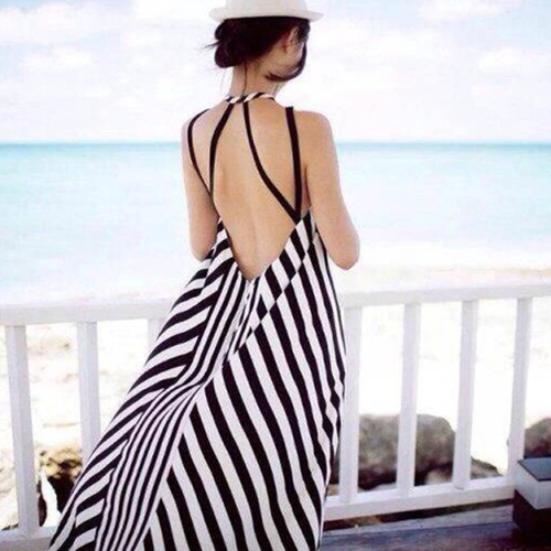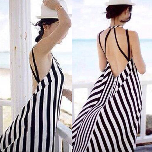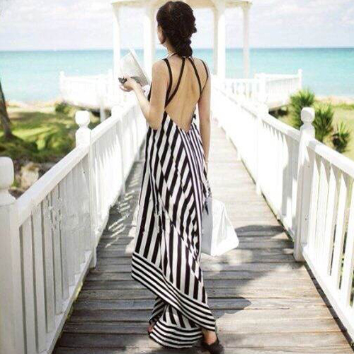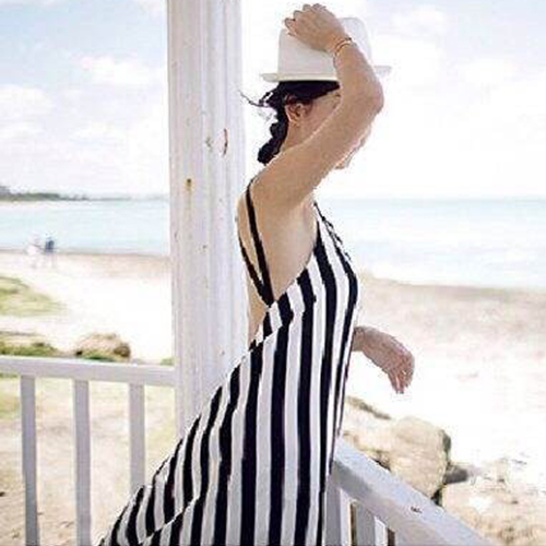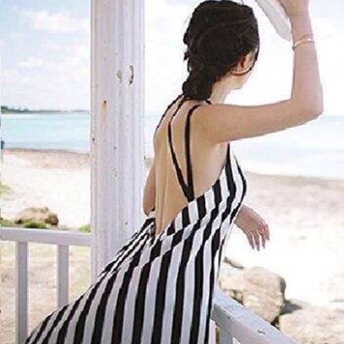 Sling style,with backless and striped design. Take it to start your happy vacation.
