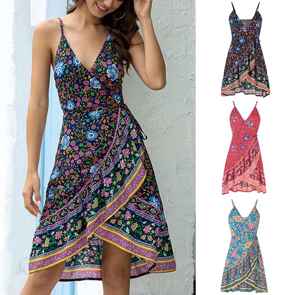 Looking for a bohemian-themed dress for your beach days and tropical getaways? Then look no further than this piece. This sling dress features chic and vibrant floral print details,with backless,v-neck and an irregular hem design,which can offer you an effortless charming and beautiful look. Adding a sweet straw hat would make you look more perfect.