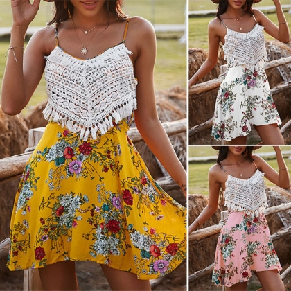 Bohemian Style Backless V-neck Tassel Spliced Printed Sling Dress