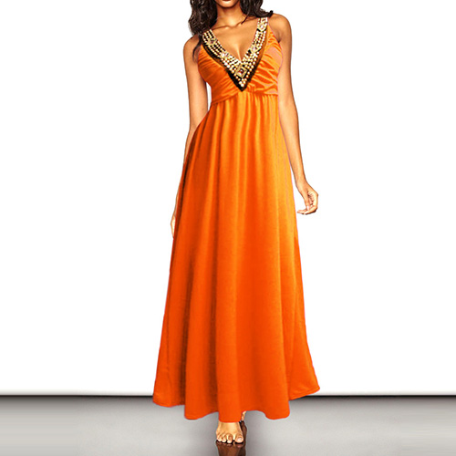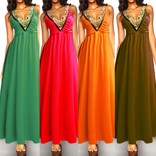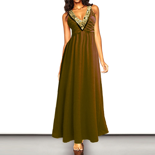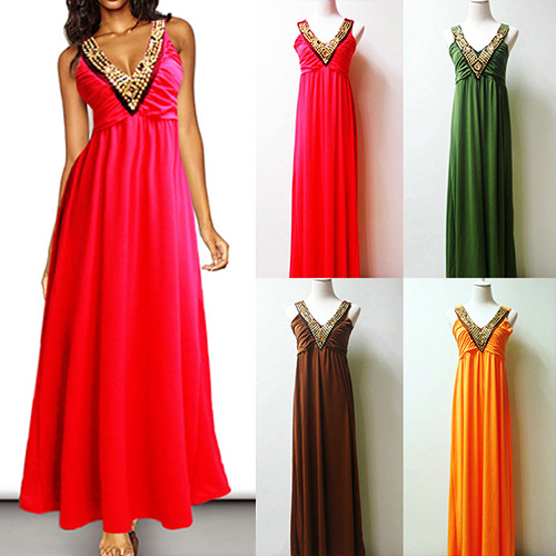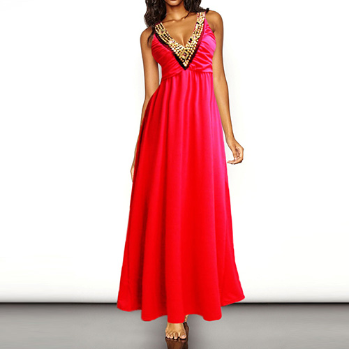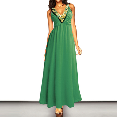 Bohemian Style Beaded Deep V-neck Sleeveless High Waist Maxi Dress