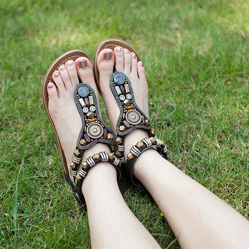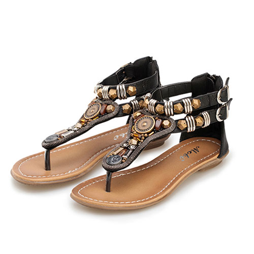 So unique and fashion sandals. It features ethnic customs string beads and metal elements for decoration.Cover heel design,metal buckle and zipper double closure.Flat heel,high quality faux leather upper material and anti-slip rubber outsole gives you a comfortable walk.Easy for matching.Come on to pursue your summer footprint with them
