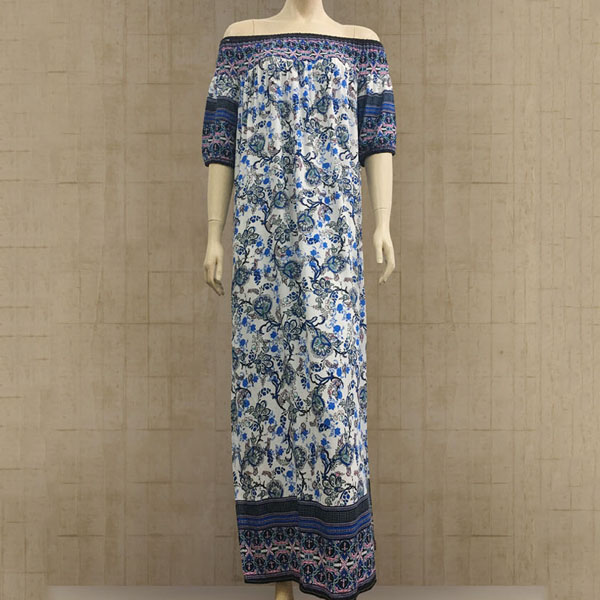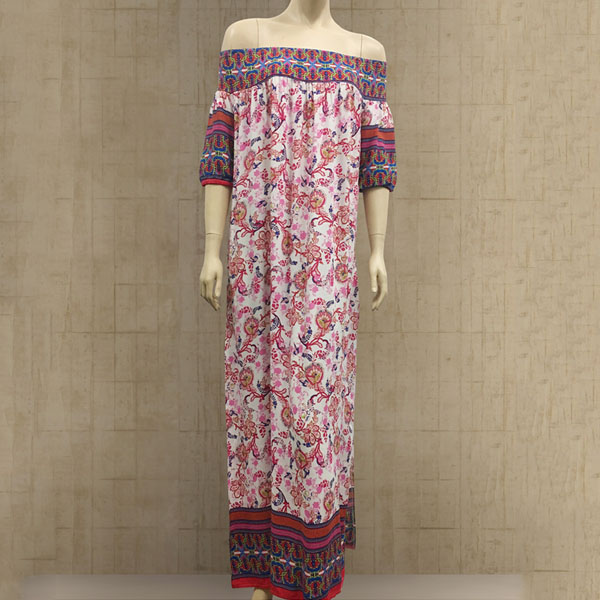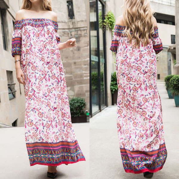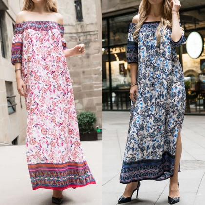 Boasts vibrant floral print,accompanied with an off-shoulder wide neckline,short sleeve,slit hem and a maxi length,