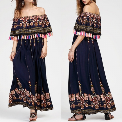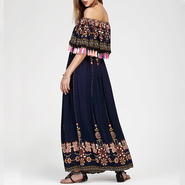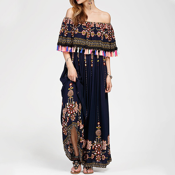 and colorful tassel design make this piece look so eye-catching and distinctive,while the off-shoulder boat neck design adds