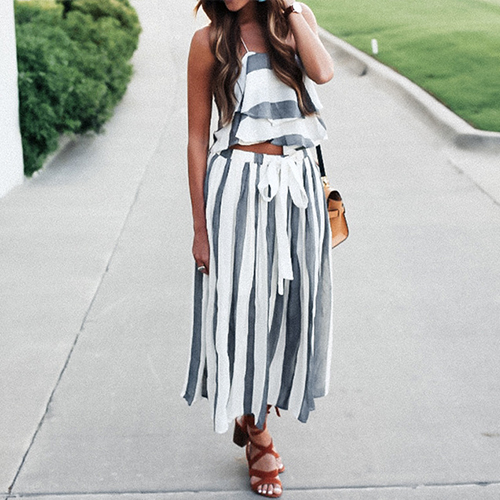 a cami top and a high waist maxi skirt,this two-piece set can make you look effortless charming. Strolling on