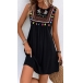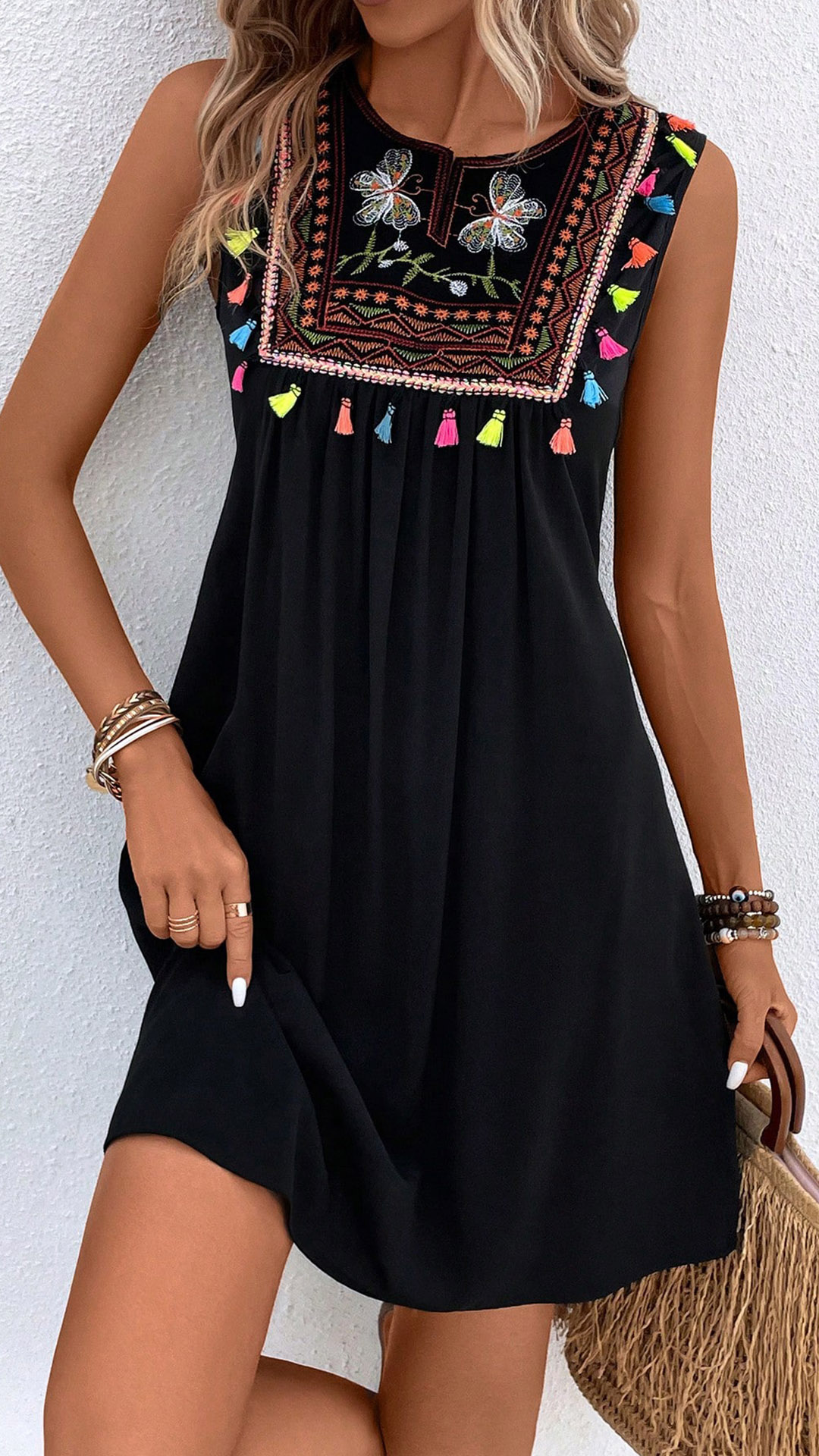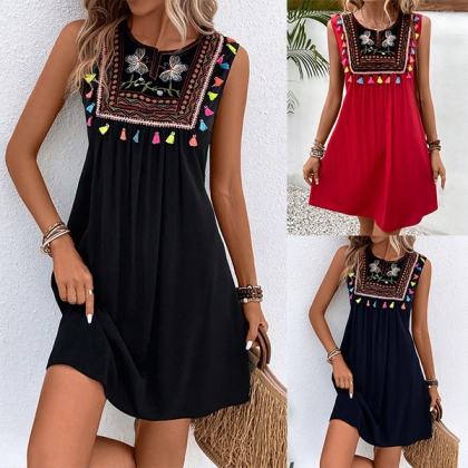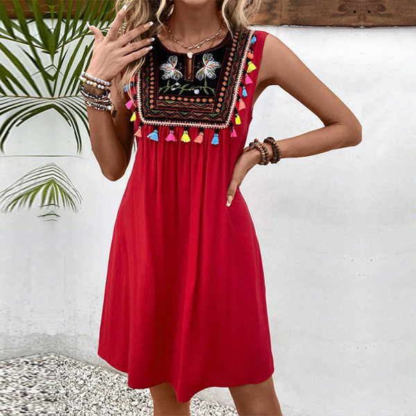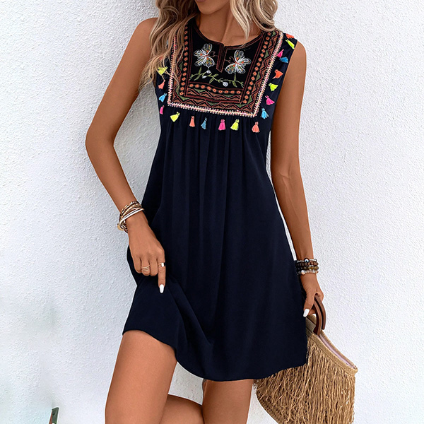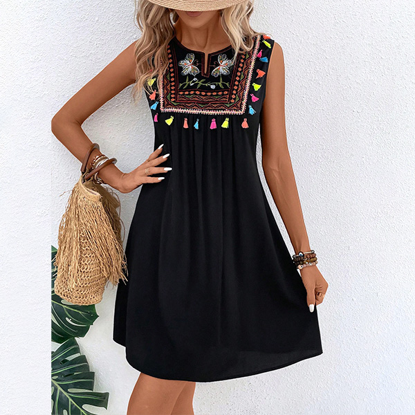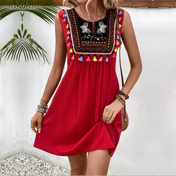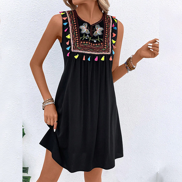 This bohemian-inspired dress with floral embroidery, tassels, and a sleeveless silhouette, perfect for summer wear!