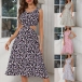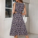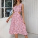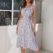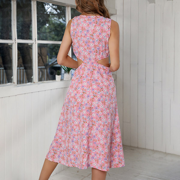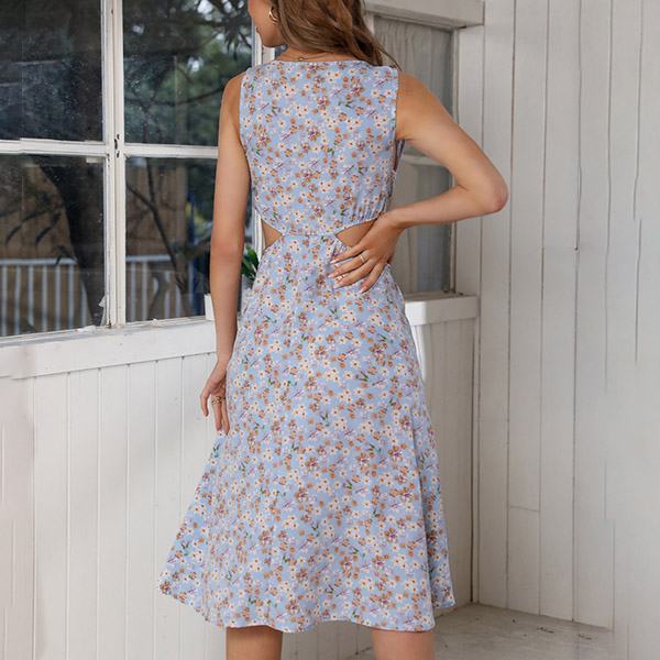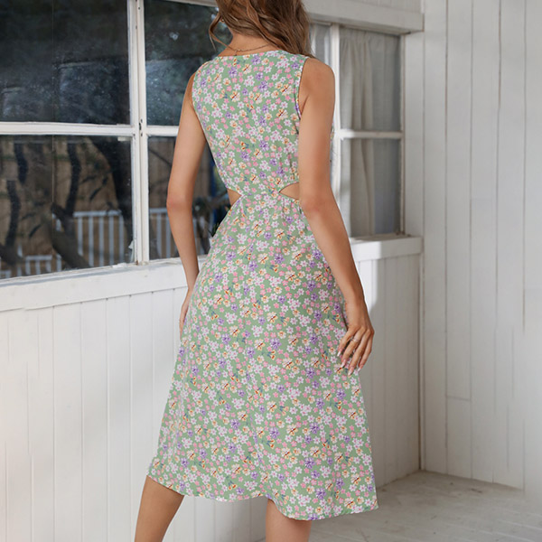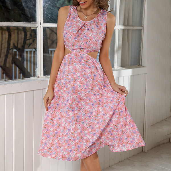 A knee-length dress featuring overall floral printed, cutout details along the waistline, sleeveless, and fit & flare silhouette.