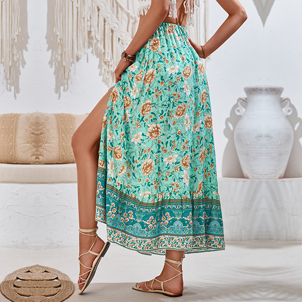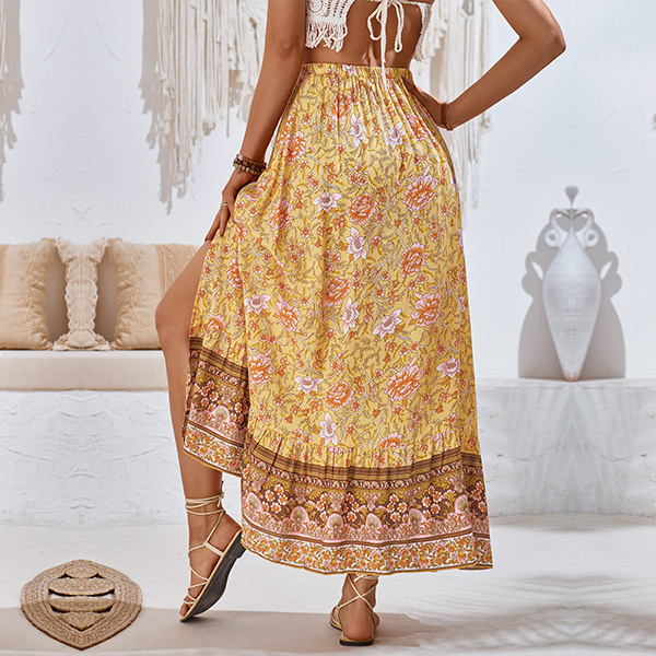 This maxi skirt is designed with a bohemian flair, featuring a delightful floral print that exudes a free-spirited and whimsical vibe. The intricate patterns and colorful blossoms add a touch of femininity and charm to the overall design. Crafted from lightweight and flowy fabric, this skirt offers both comfort and ease of movement.
