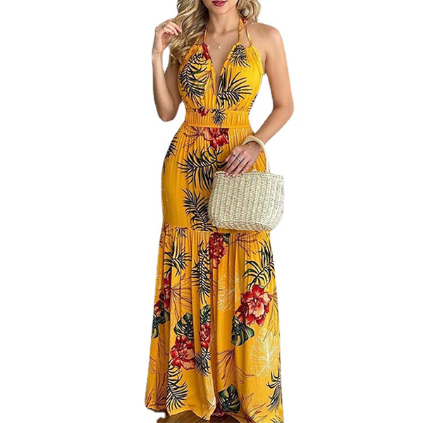 Fashion Floral Printed Halterneck Backless Maxi Dress
