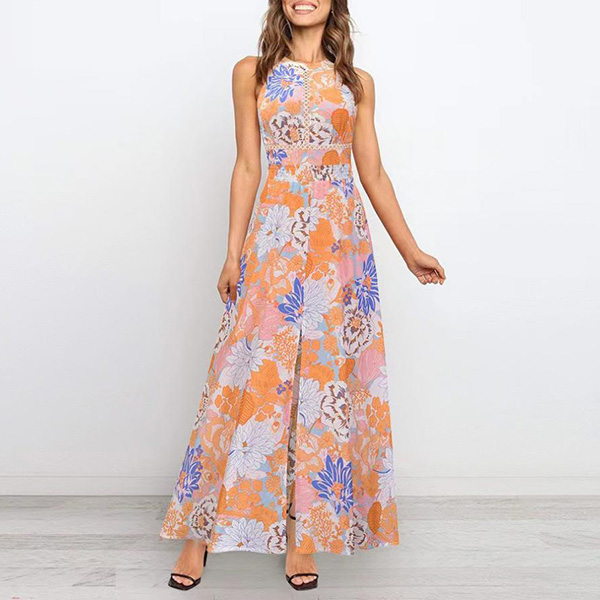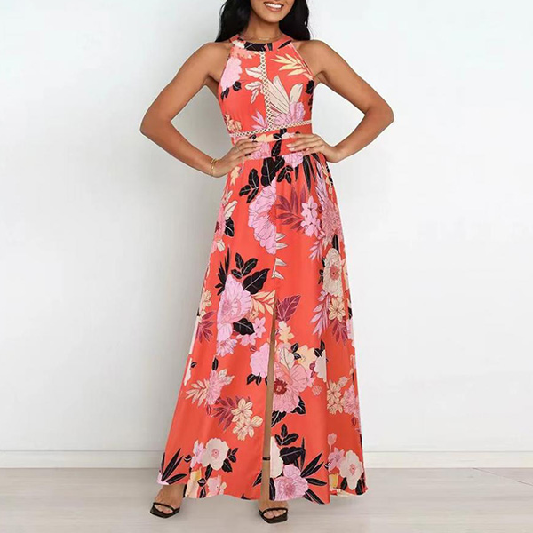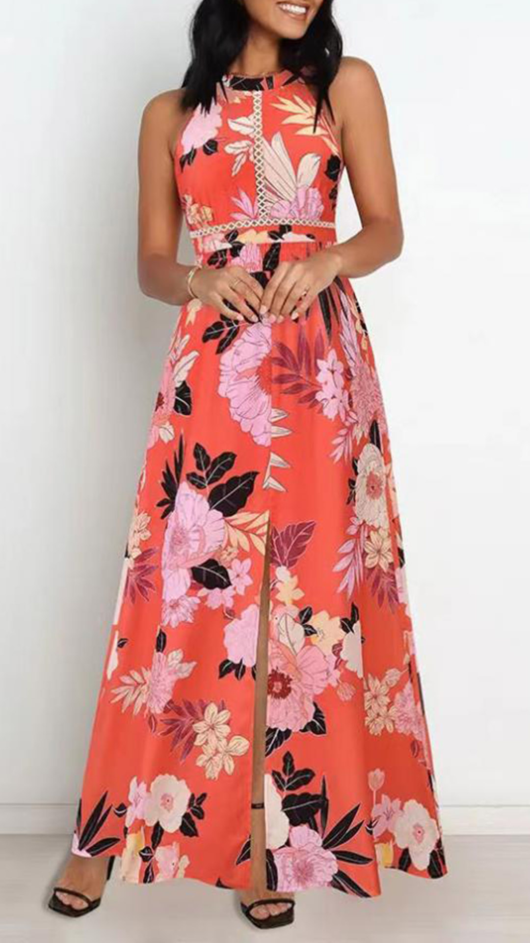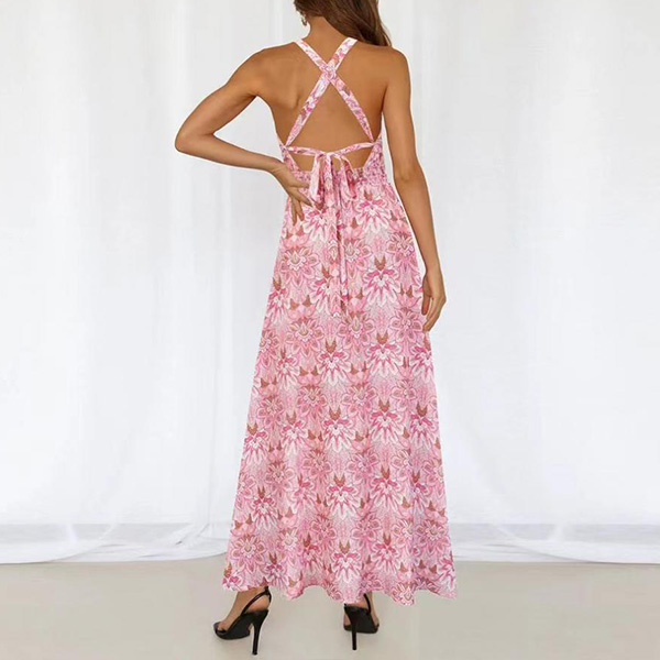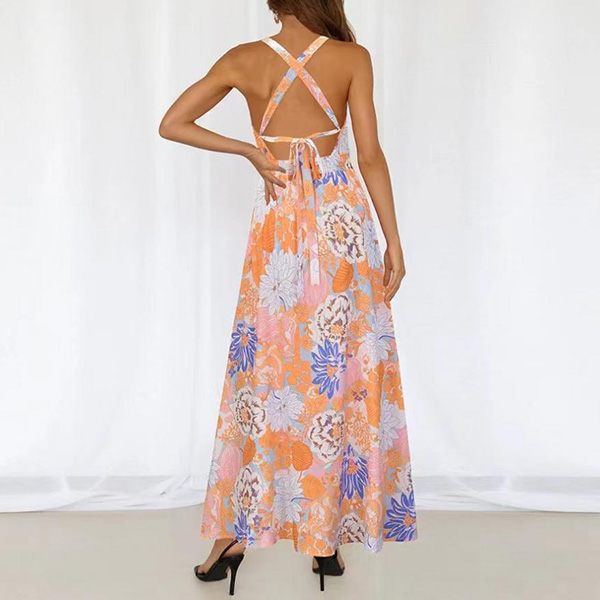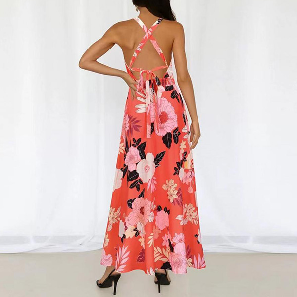 Bohemian Style Floral Printed Halter Criss-cross Backless Slit Maxi Dress