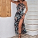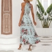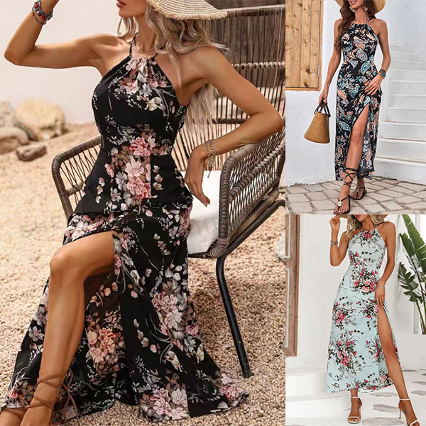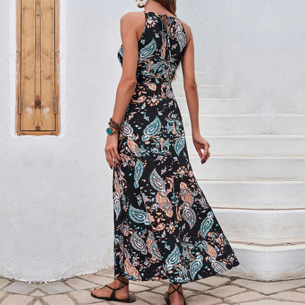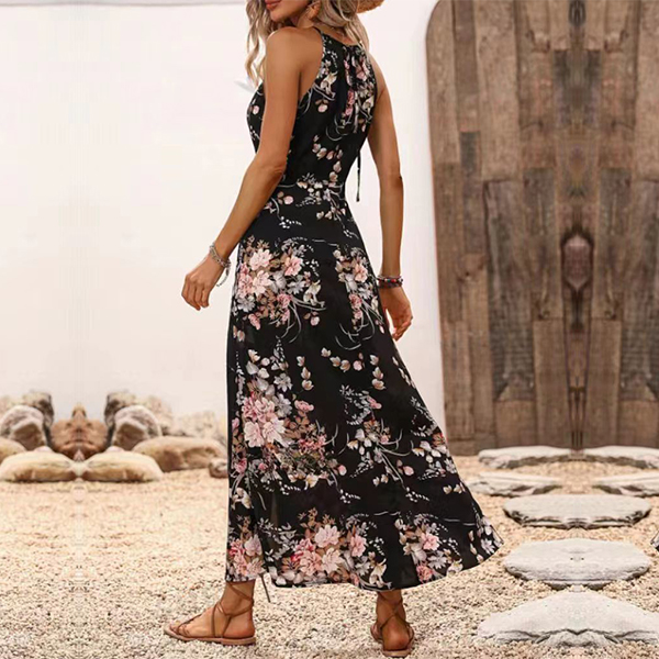 Bohemian Style Floral Printed Halter Neck Sleeveless Side Slit Midi Dress