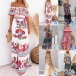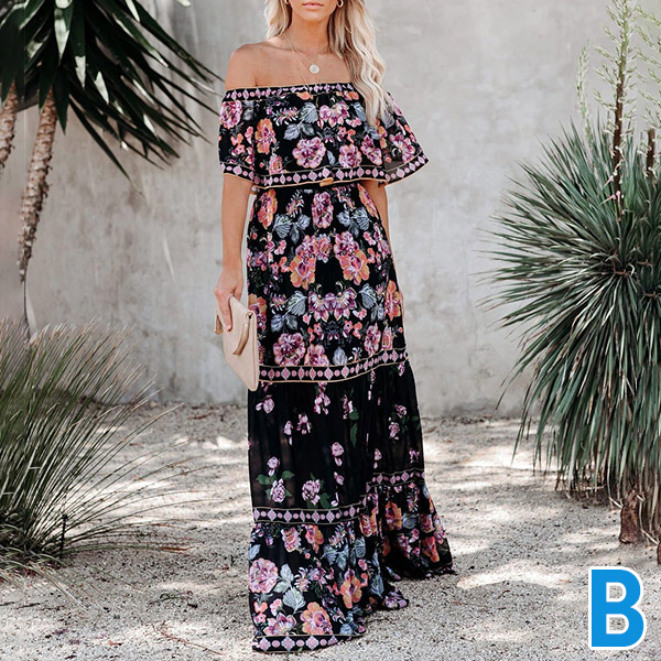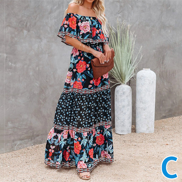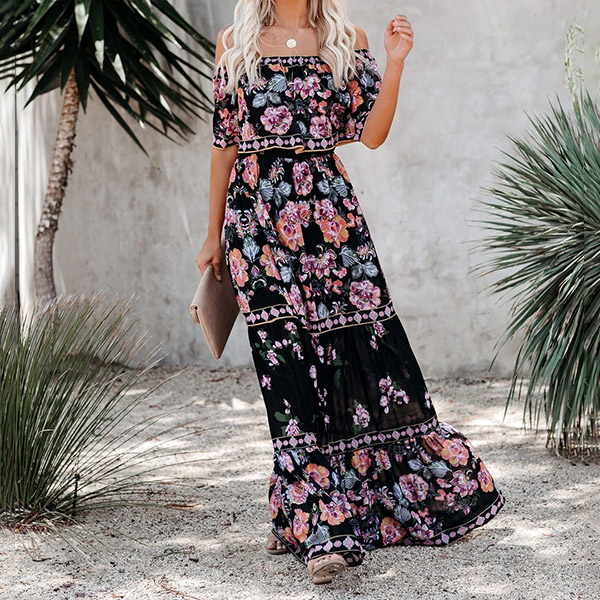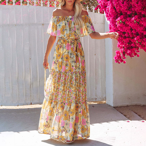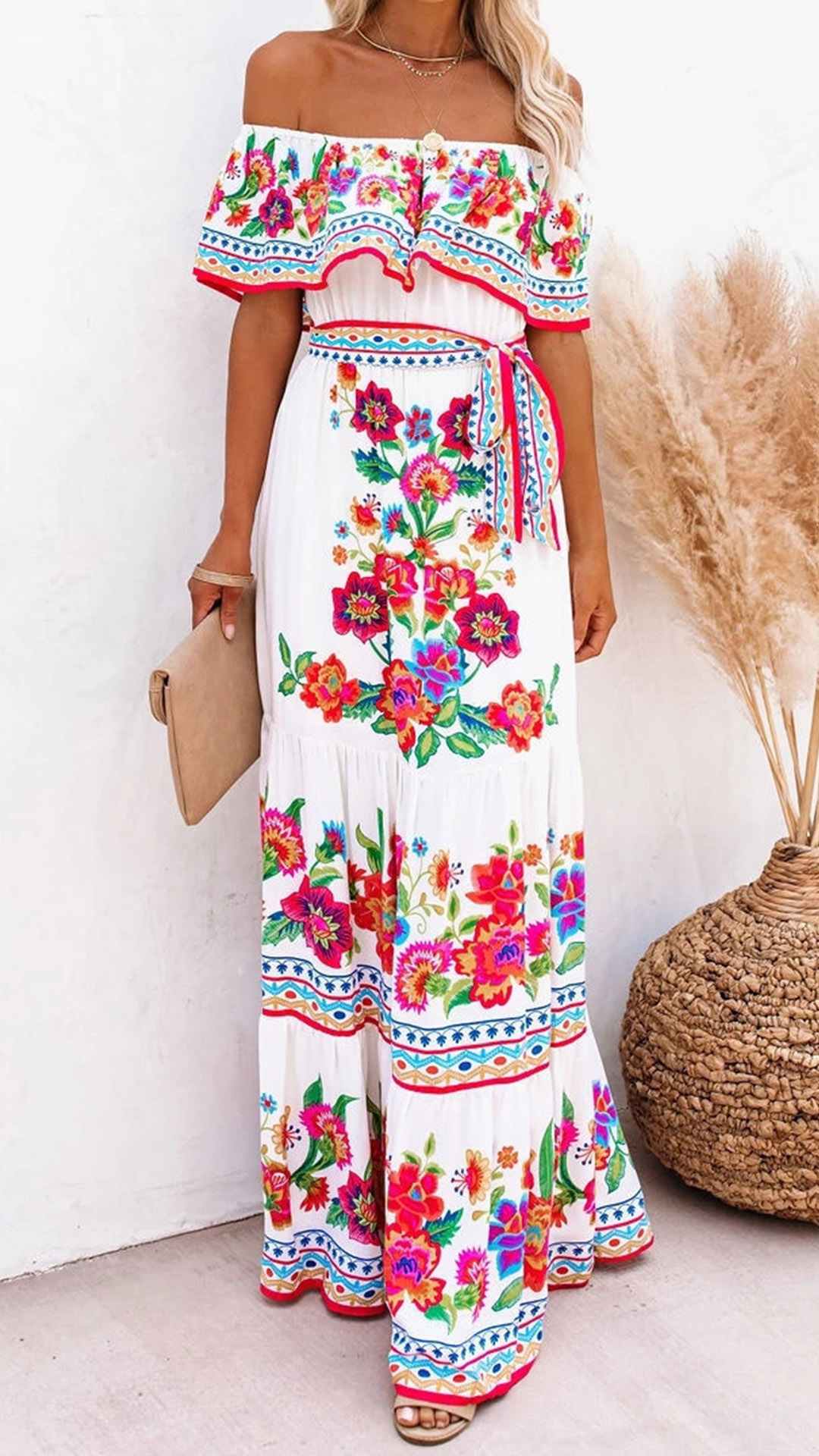 Bohemian Style Floral Printed Off-the-shoulder Self-tie Maxi Dress
