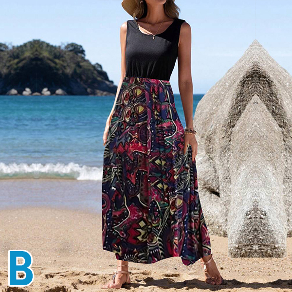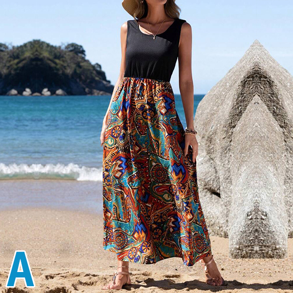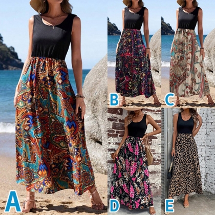 Bohemian Style Floral Printed Round Neck Sleeveless Dress