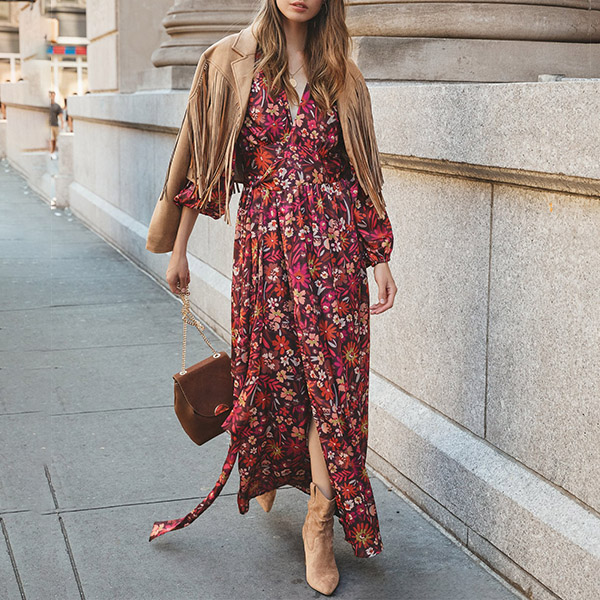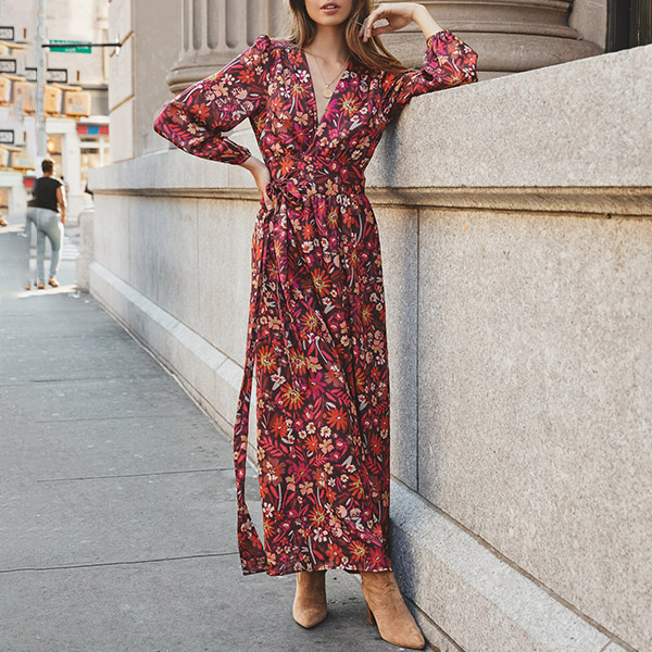Bohemian Style Floral Printed Tie-belt Long Wrap-front Dress