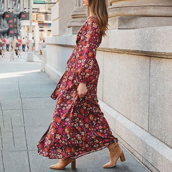 Bohemian Style Wrap-front Dress, vintage style for the latest fashion trend! Calf-length, floral-patterned dress in softly draped woven fabric. Low-cut V-neck and wrap over front with tie-belt at the waist. Long sleeves and narrow cuffs, unlined. You can easily be the focus when you don this little stunner.