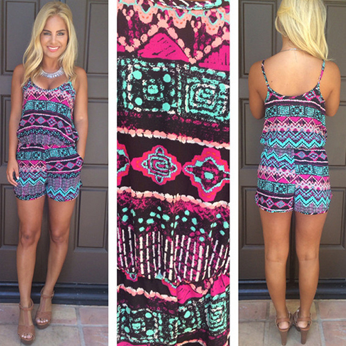 romper features abstract print,with an elastic waist and adjustable cami straps. Pair it with your favorite