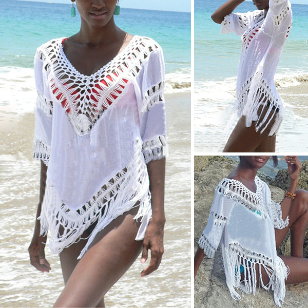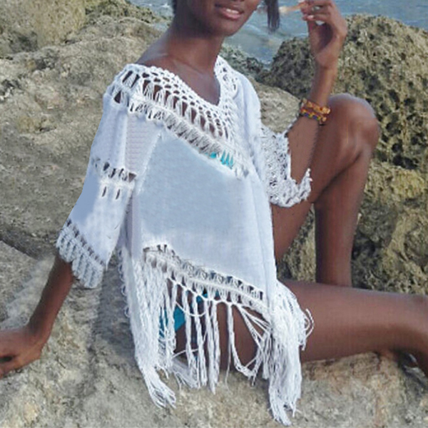 Bohemian Style Half Sleeve Tassel Hem Hollow Out Bikini Smock
