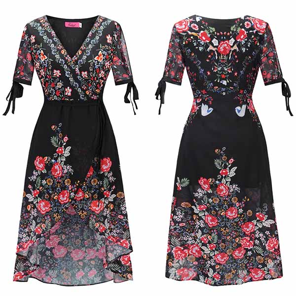 Boasts eye-catching printed pattern,the slit half sleeve,v-neck and irregular hem design make this piece