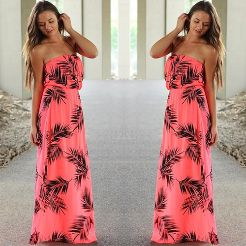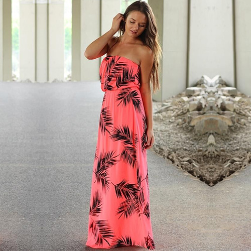 cater to any occasion! This strapless maxi dress surely fits you. Chic floral print and high