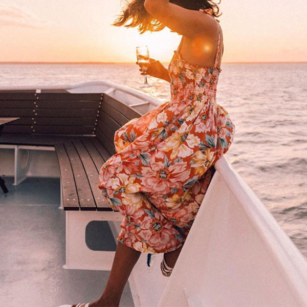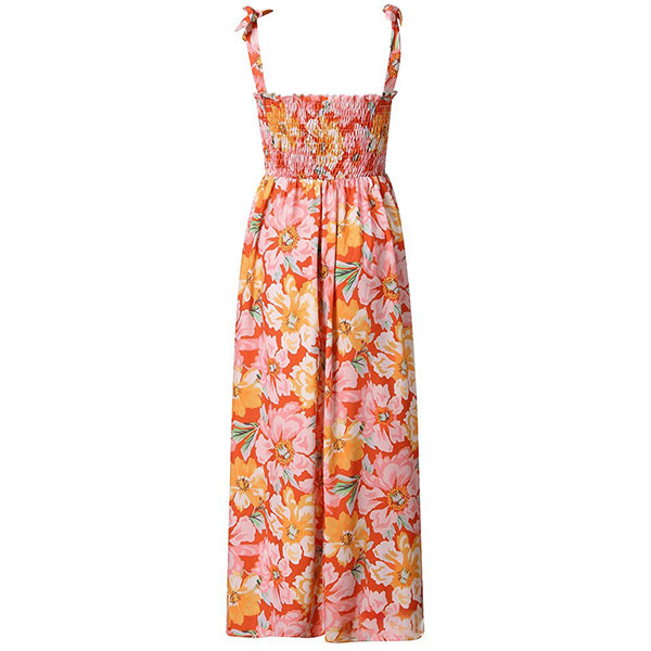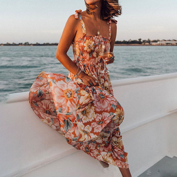 When walking on the beach with this dreamy dress,you can easily be a pleasant sight to draw more attention. Sling style and backless design will make you look sexy and flirty,while the vibrant floral print details will make this piece look more eye-catching. On these sunny days,adding a sweet straw hat would make you look more perfect!
