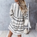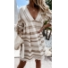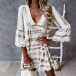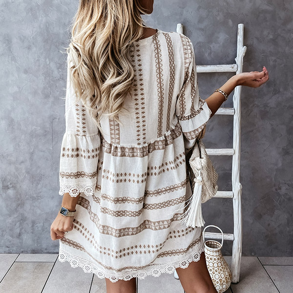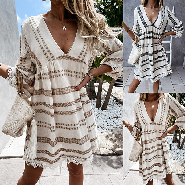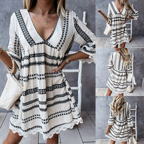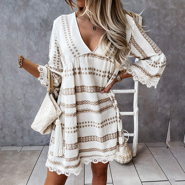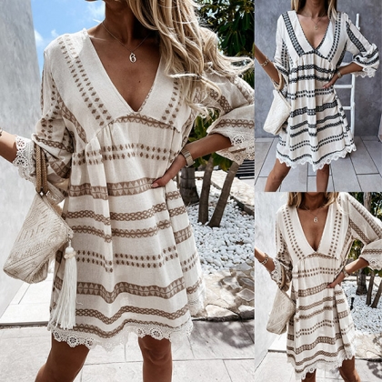 Bohemian Style Lace Spliced 3/4 Sleeve V-neck Printed Dress