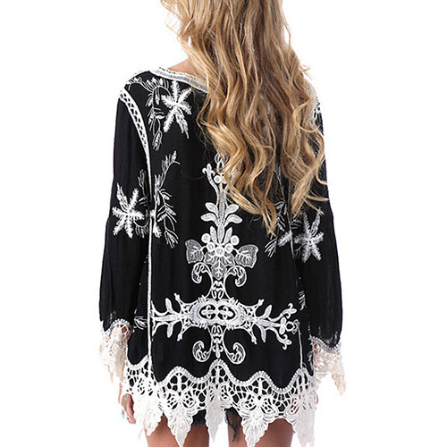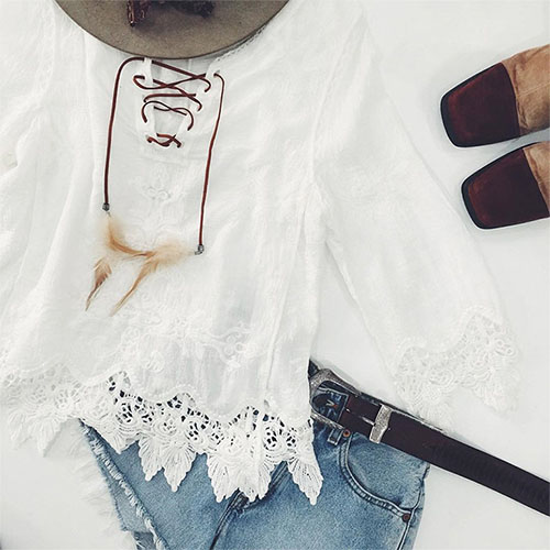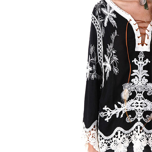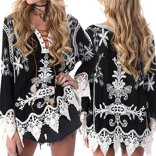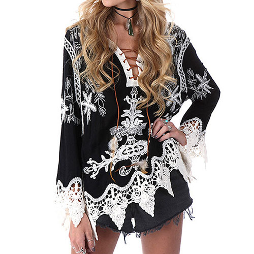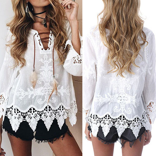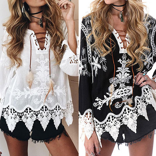 I promise only need one glance,you would be attracted by this chic yet feminine blouse. Its lace-up v-neck and hollow out lace spliced