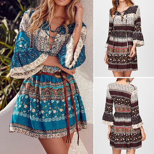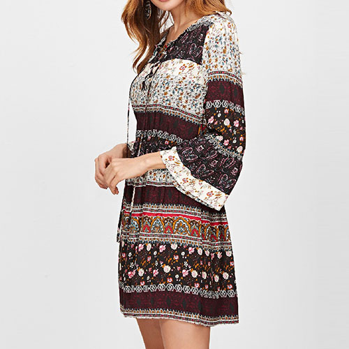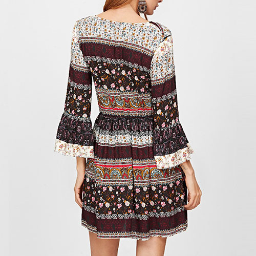 vibrant floral print,its lace-up v-neckline and trumpet sleeve design makes this