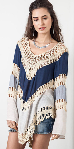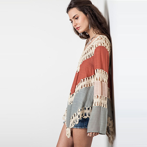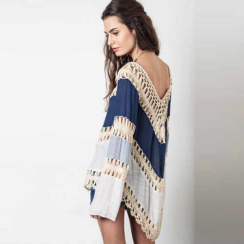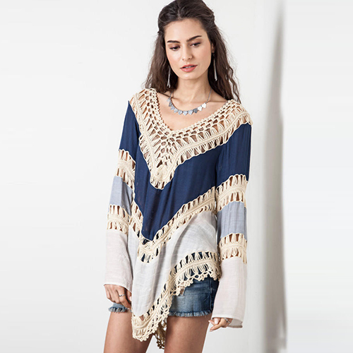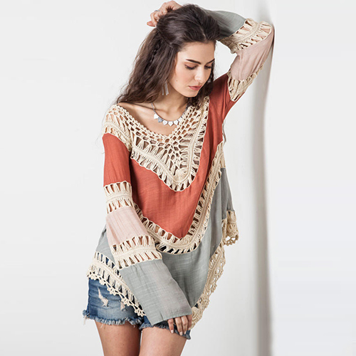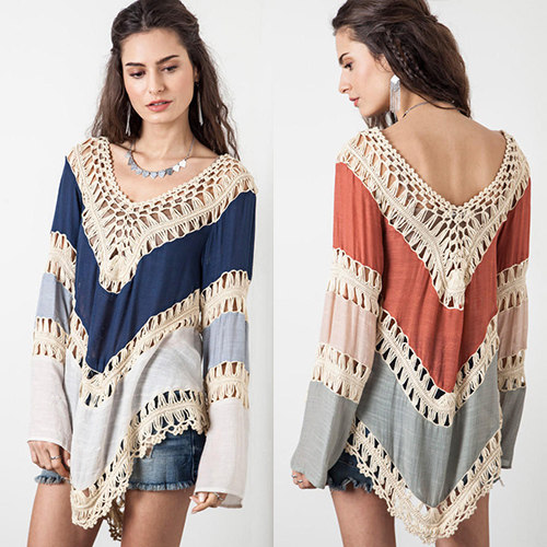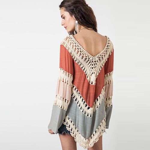 Bohemian Style Long Sleeve Hollow Out Crochet Contrast Color Smock