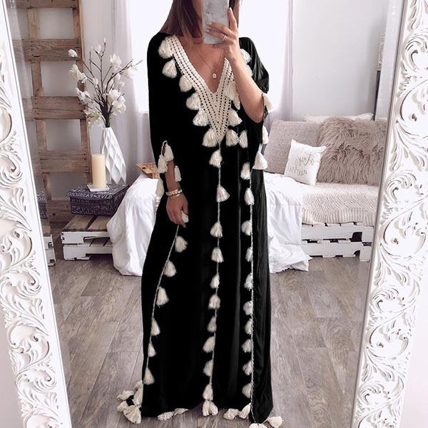 Bohemian Style Long Sleeve V-neck Tassel Spliced Maxi Dress