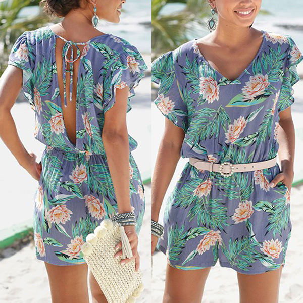 When the summer season hits,this bohemian style romper is worth to arouse your attention. Features chic printed details,the backless,v-neck and lotus sleeve design will lend you a dash of sweet and flirty vibes. For your beach days and tropical getaways,this wonderful piece can be your wise choice.