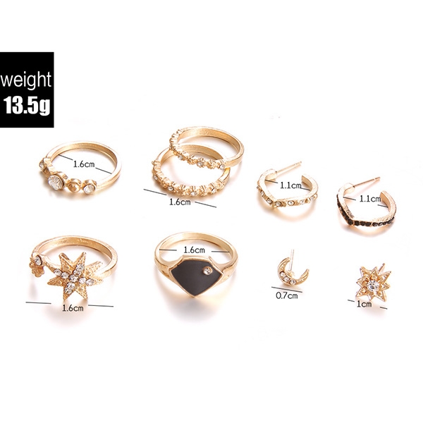 on this accessory set? It comes with a classic yet stylish gold tone,including 5 pieces rings and 4 pieces stud