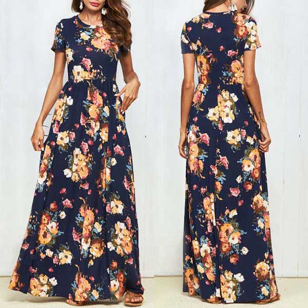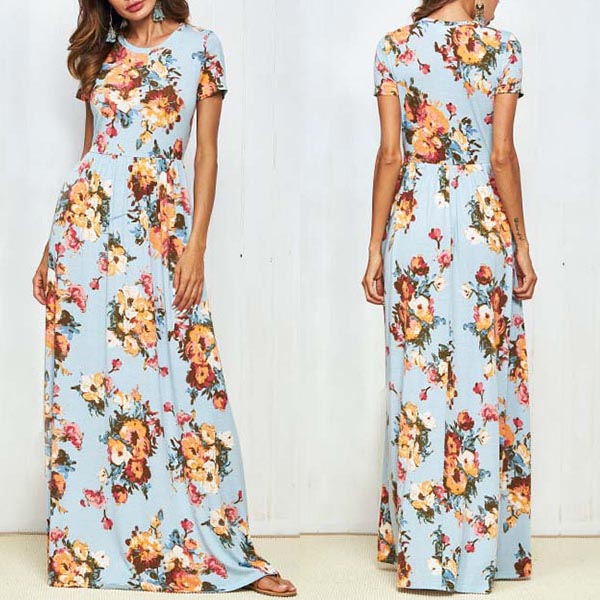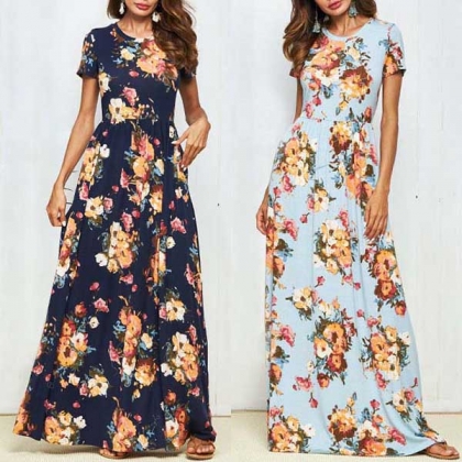 Boasts vibrant floral print,accompanied with short sleeve,round neck and a maxi length,this dress