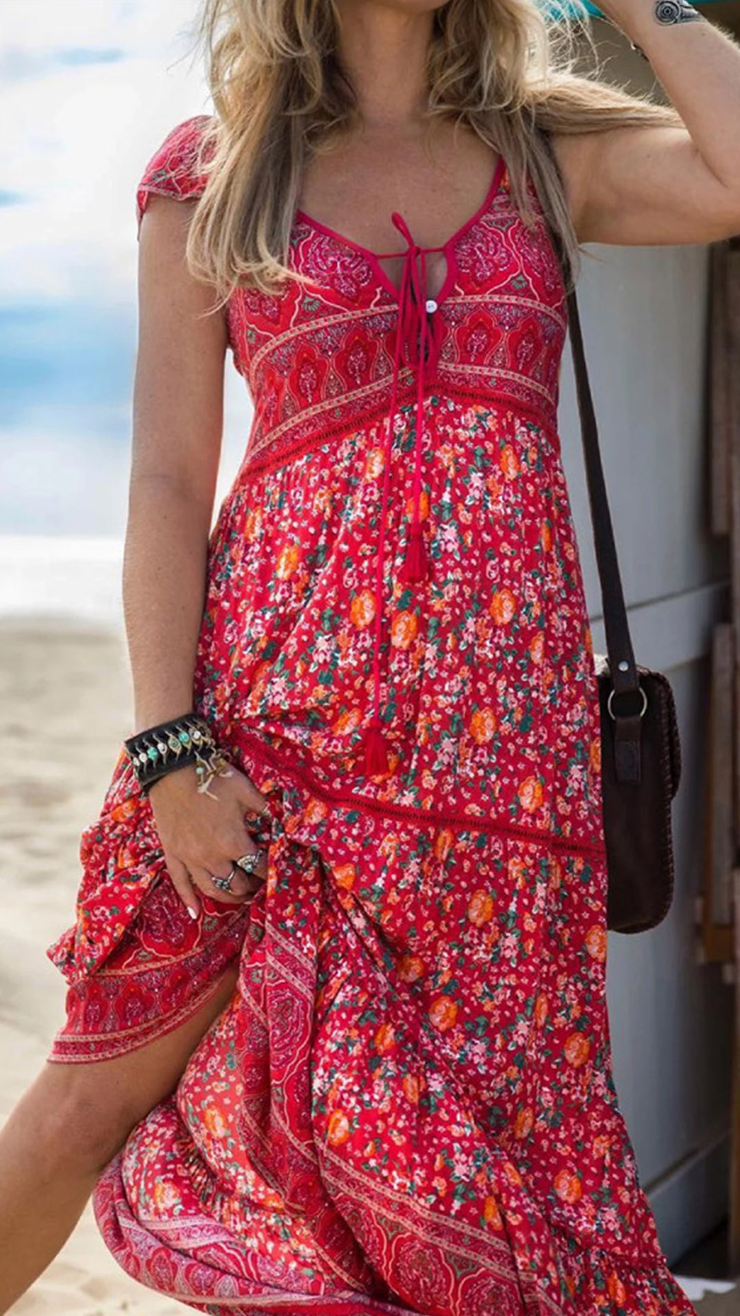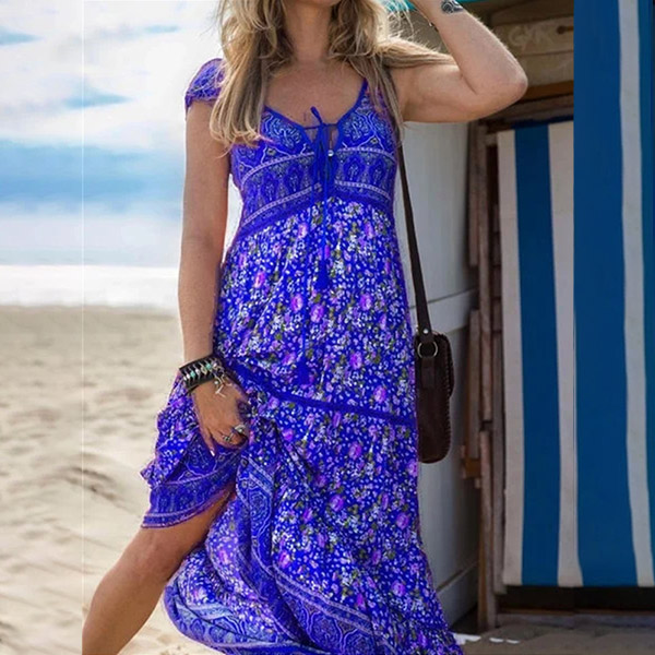 For your beach days and tropical getaways,this bohemian style dress would be your wise choice. Its vibrant floral print details make this piece look so eye-catching. Finished with short sleeve,v-neck,high waist and a maxi length,this dress can make you look effortlessly charming and beautiful.