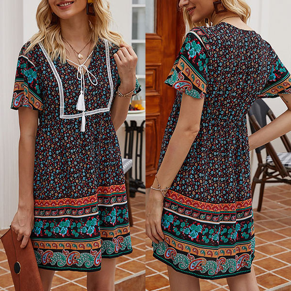 Bohemian Style Short Sleeve V-neck Printed Dress