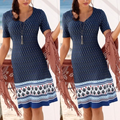 Bohemian Style Short Sleeve V-neck Printed Dress
