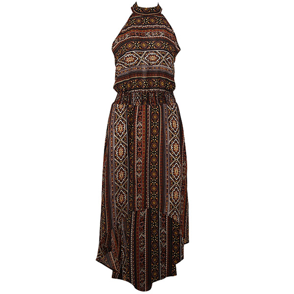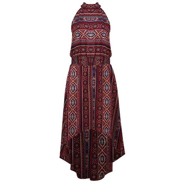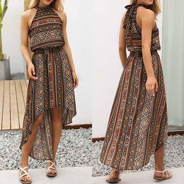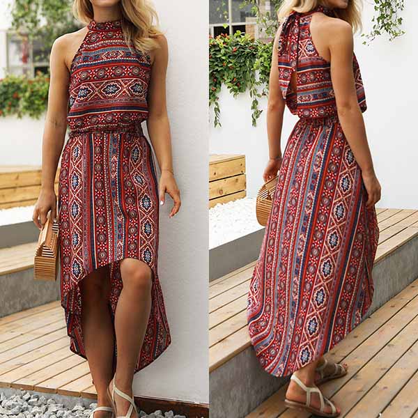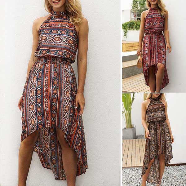 This bohemian-themed dress features chic and eye-catching printed pattern,the off-shoulder,backless and