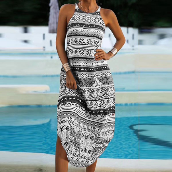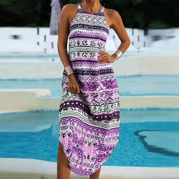 Bohemian Style Sleeveless Round Neck Arc Hem Printed Dress