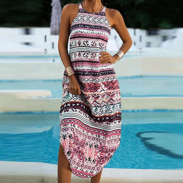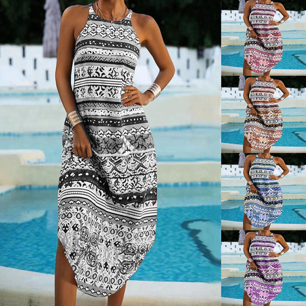 Make your wardrobe more colorful by adding this bohemian style printed dress. Its chic printed details can help you catch more eyes. It is outfitted with sleeveless,round neck and an arc hem,this dress knows how to give you a cozy yet stylish summer style.