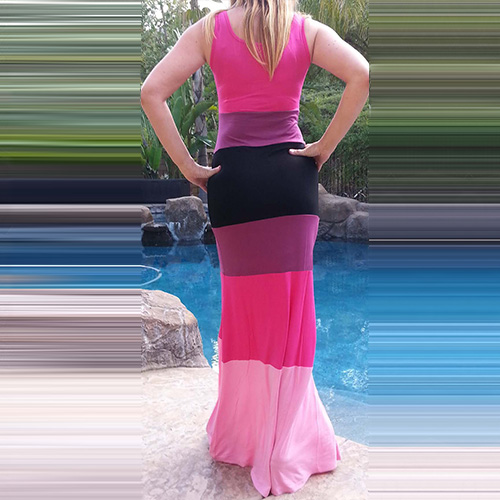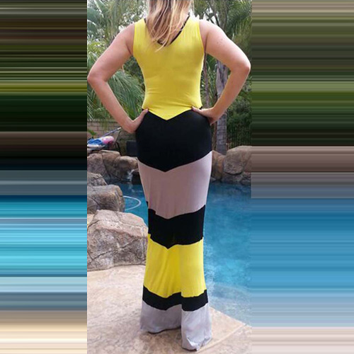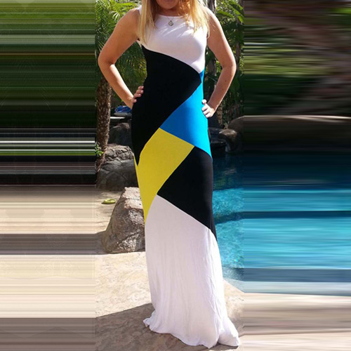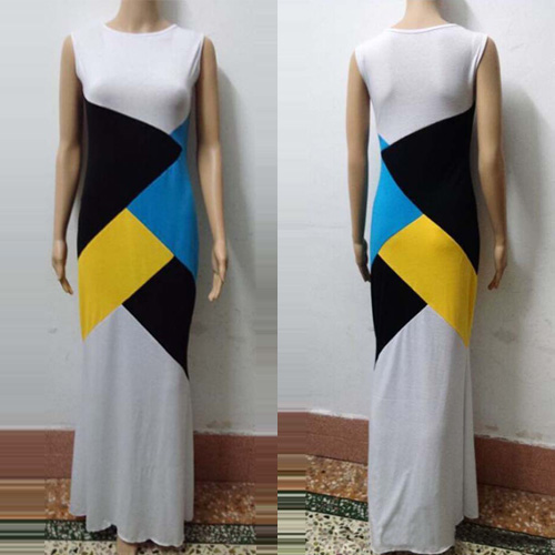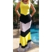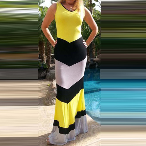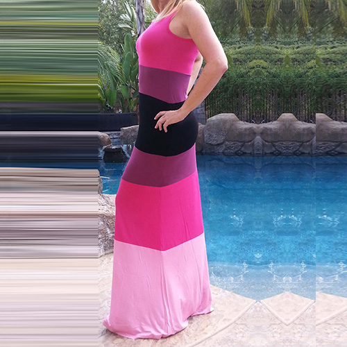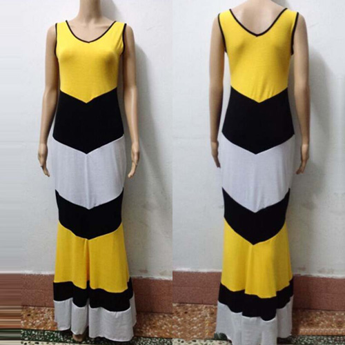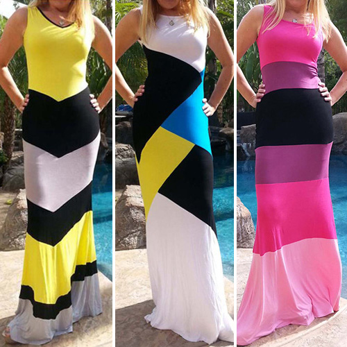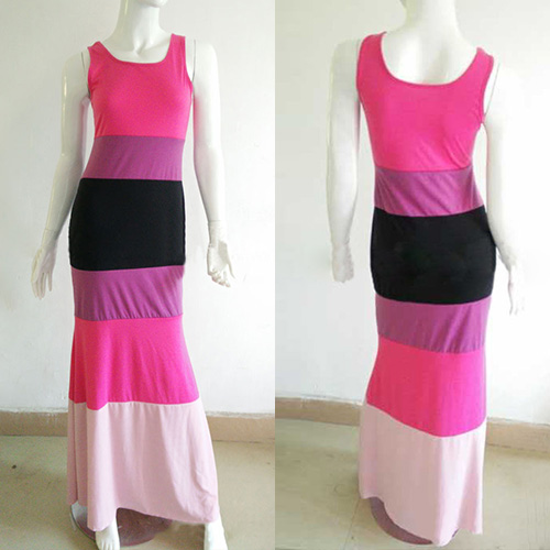 Contrast color striped with sleeveless,round neck and maxi length design,this sleeveless dress should be