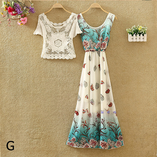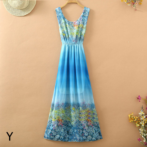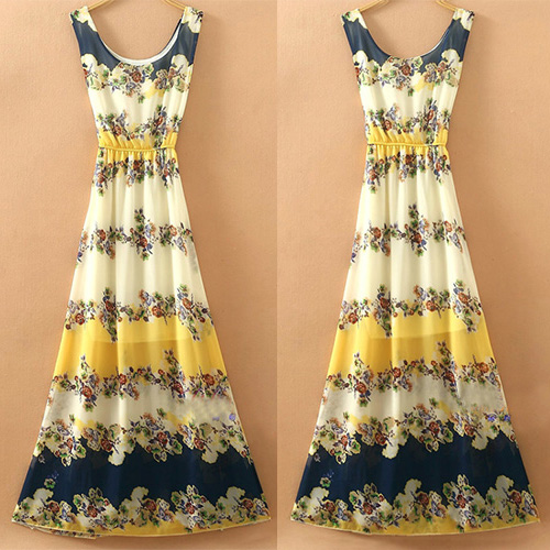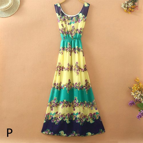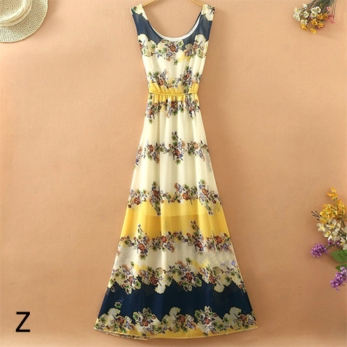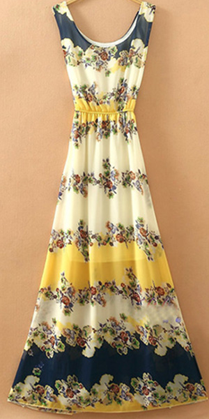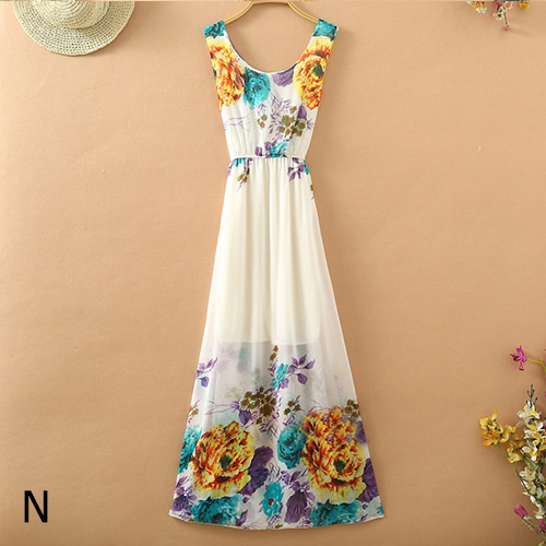 Bohemian Style Sleeveless Round Neck Floral Print Chiffon Maxi Dress