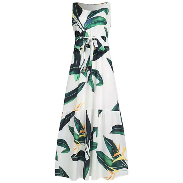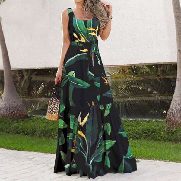 Bohemian Style Sleeveless Round Neck High Waist Printed Maxi Dress