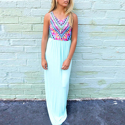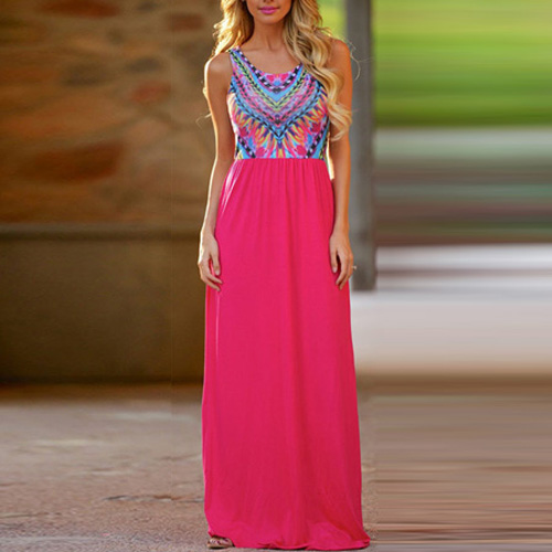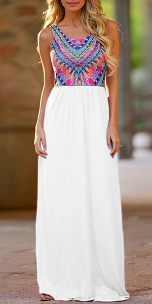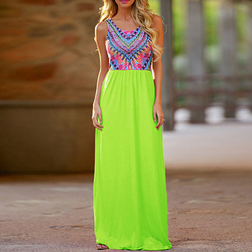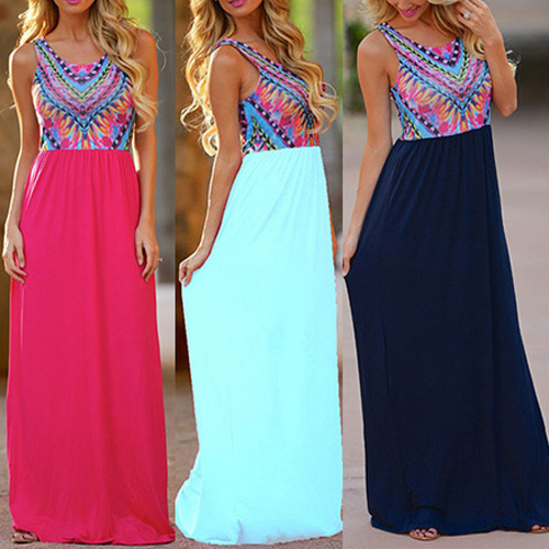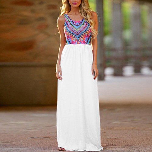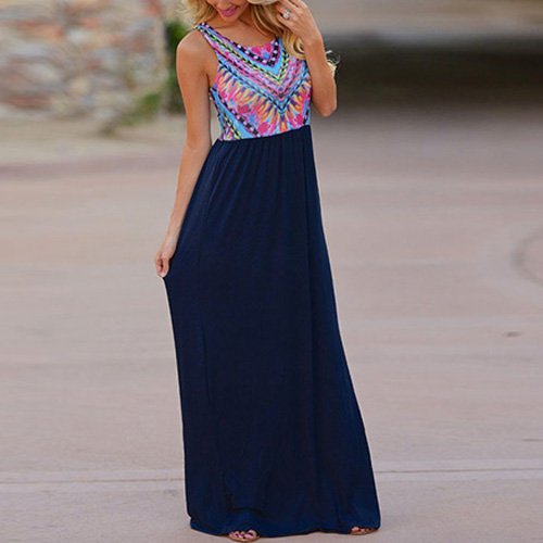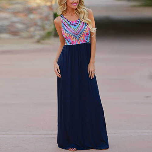 Bohemian style floral print,with sleeveless,round neck,high waist and flowing hemline design. Adding