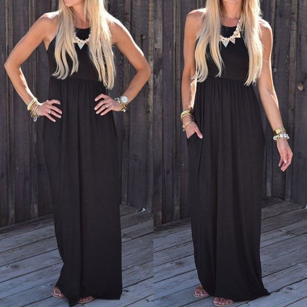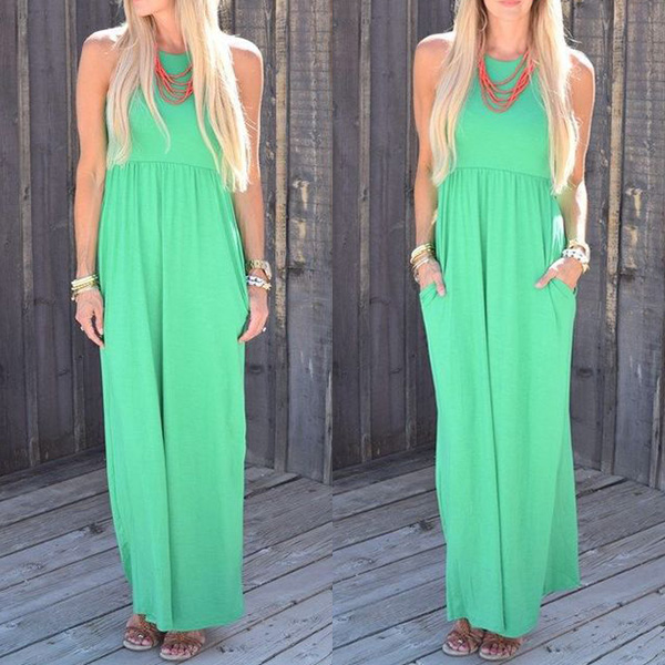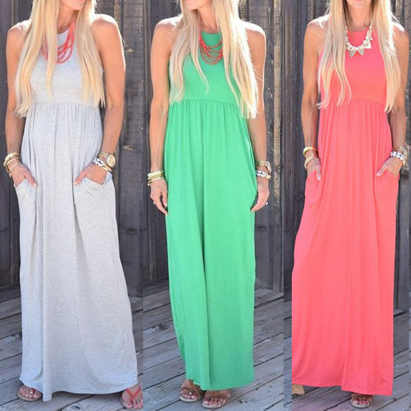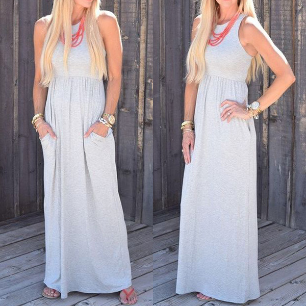 Solid color style,crafted from soft and breathable fabric,accompanied with sleeveless,round neck and a maxi length,