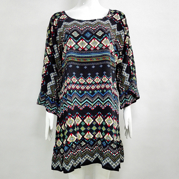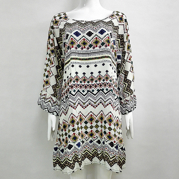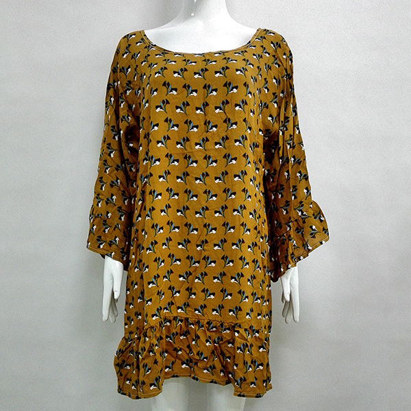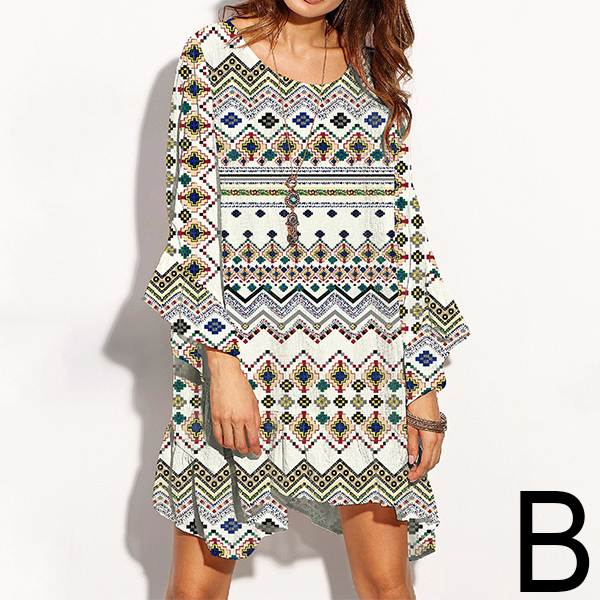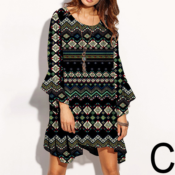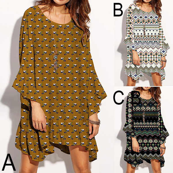 printed pattern,designed with trumpet sleeve,round neck,an irregular hem and a loose silhouette,this dress is a