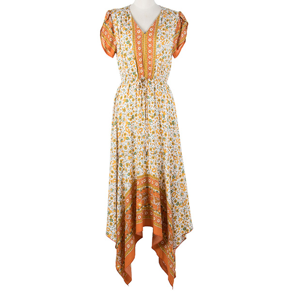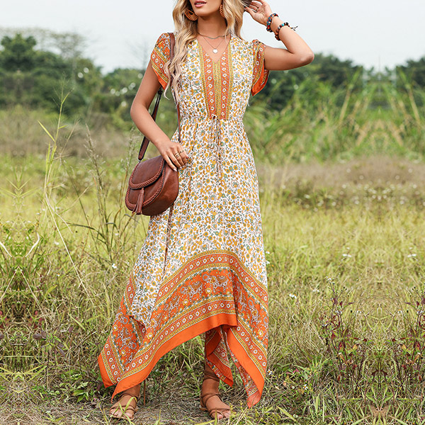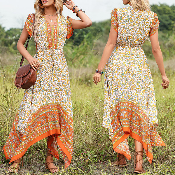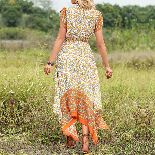 Bohemian Style V-neck Short Sleeve Irregular Hemline Midi Dress