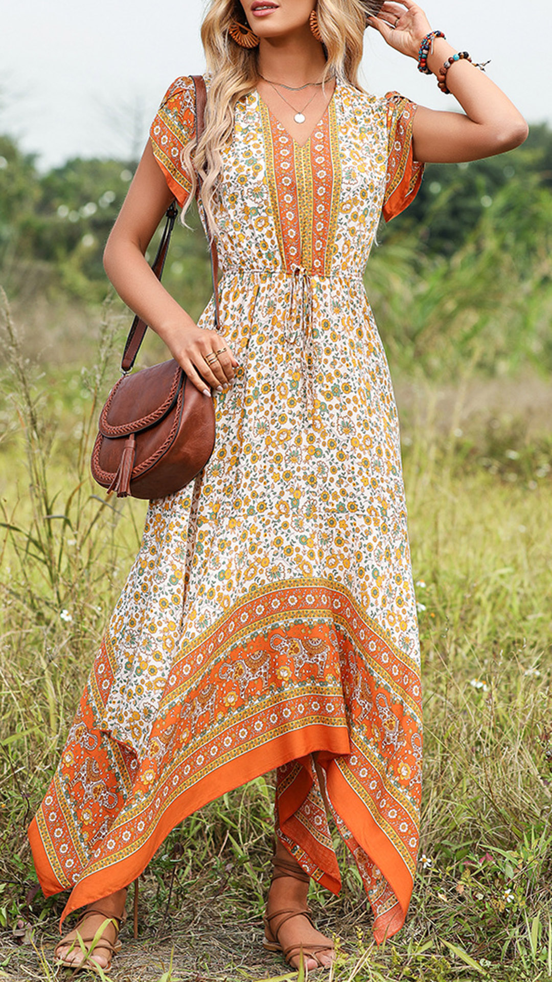 This Bohemian Style Midi Dress is the perfect way to show off your free-spirited style. It features the overall printed design! The lightweight fabric is comfortable and breathable, while the V-neck and short sleeves give it a classic look. The irregular hemline adds a chic element to this dress, wanna have a try?