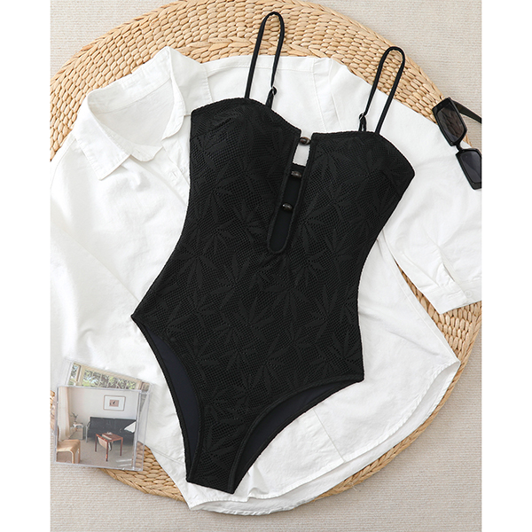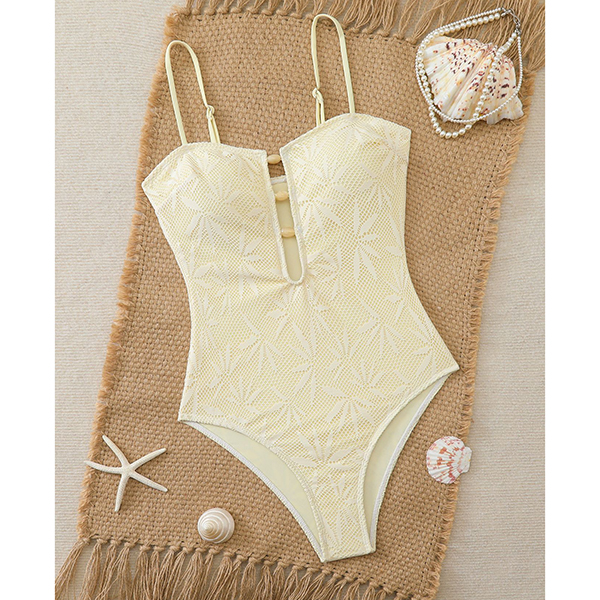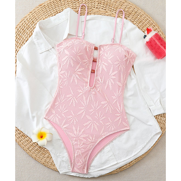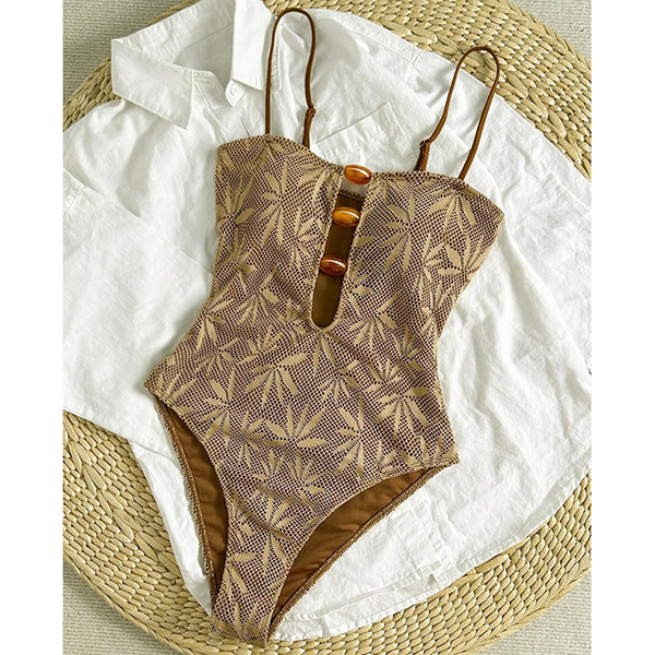 Bohemian Textured Leaf One-Piece Swimsuit with Resin Stone Cutout